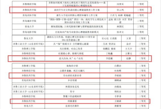 鲁网10月11日讯近日,由山东省高等学校思想政治教育研究会大学生心理健康教育专业委员会举办的2025年山东省高校心理健康教育月展示活动评选结果揭晓,齐鲁医药学院喜获二等奖一项、三等奖三项。